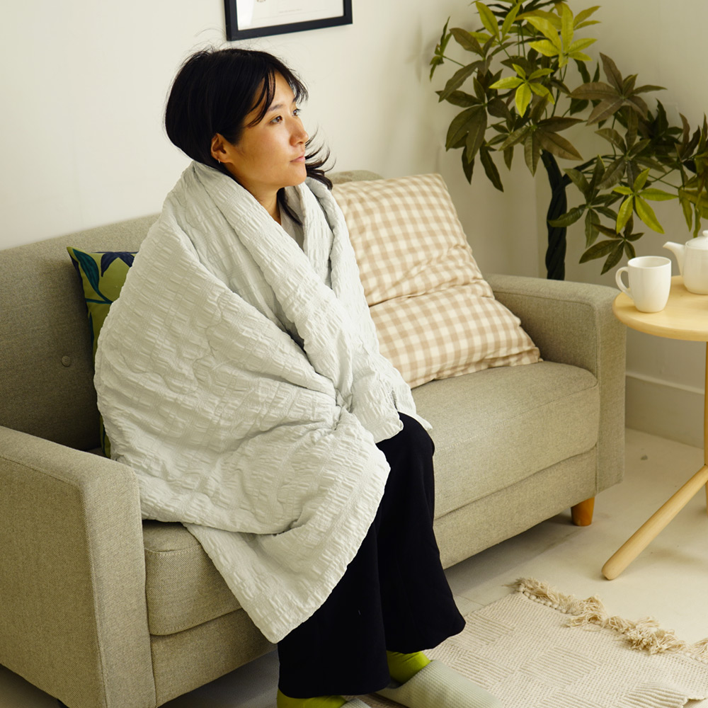 お休みの時はもちろん、ソファで羽織ったり、ひざ掛けにしたりと様々なシチュエーションで1年中使えます。。