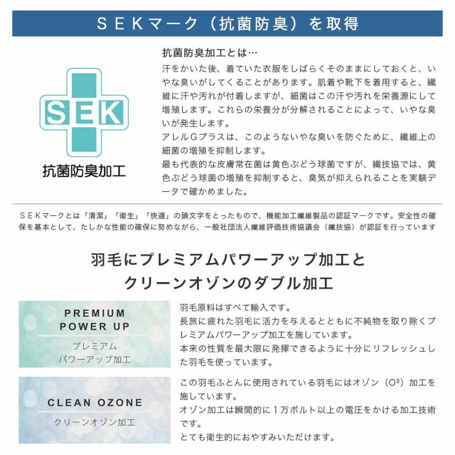 | 中身 | ホワイトダックダウン50% フェザー50% 0.6kg アレルGラベル プレミアムパワーアップ・クリーンオゾン加工 |