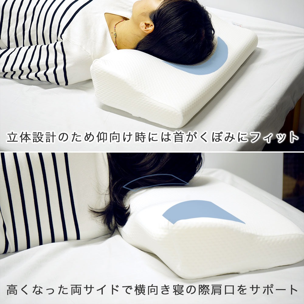 特殊な立体モールド設計でいろいろな寝姿勢にやさしくフィットし、首と肩をサポートする