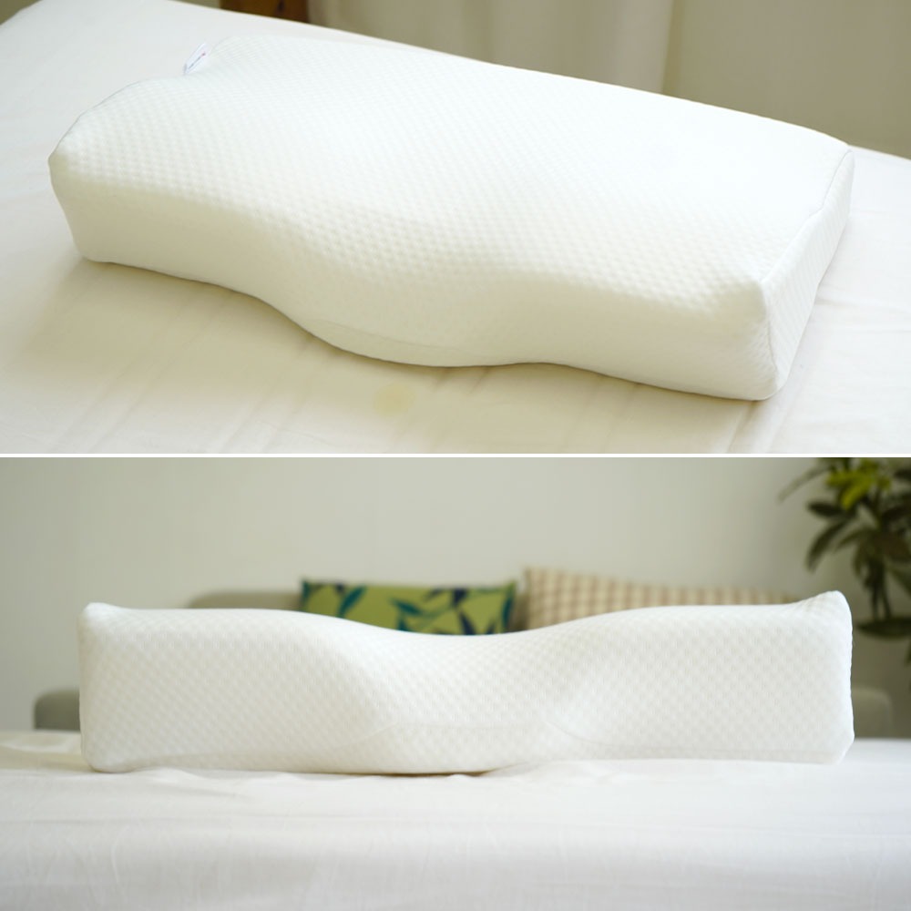 仰向けで寝る際は、中央にあるくぼんだ部分が首にフィットし、頸椎部分を支えます。