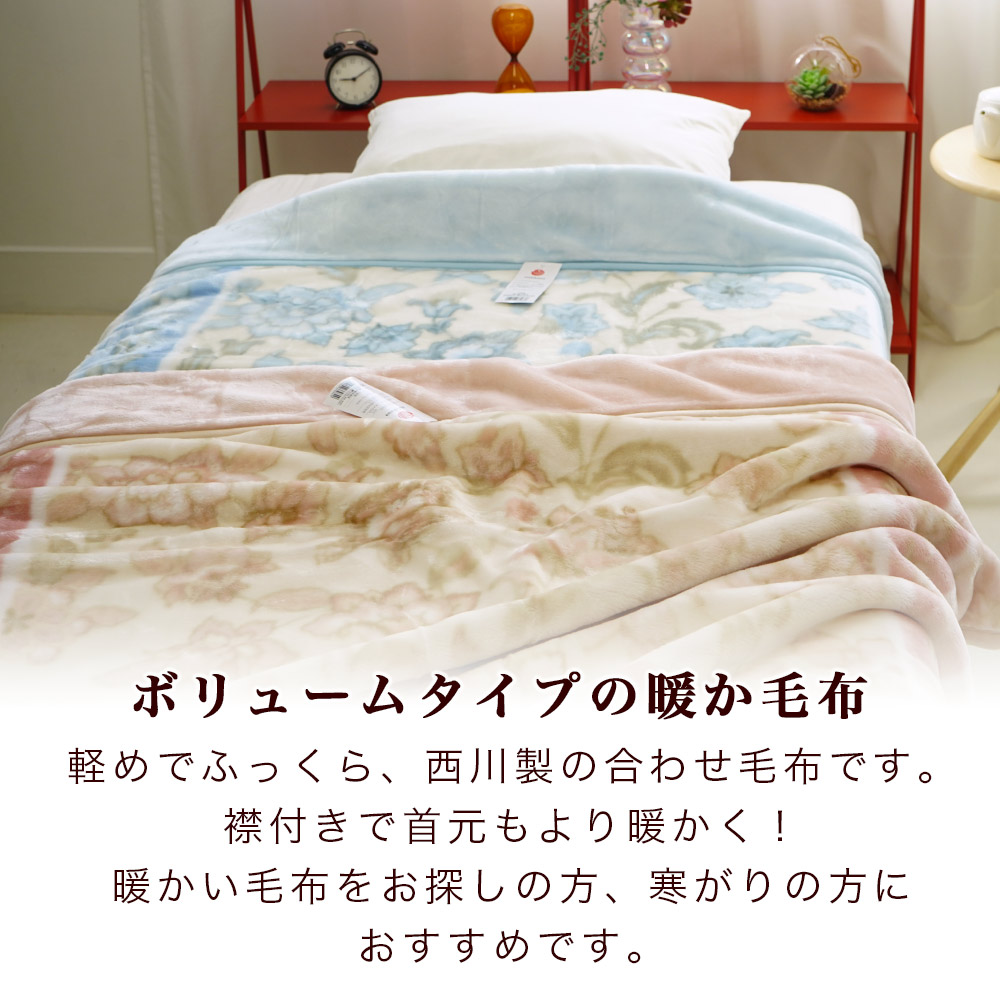 襟付きで暖か ふっくらボリューム 西川 マイヤー合わせ毛布 シングルサイズ(140×200cm)