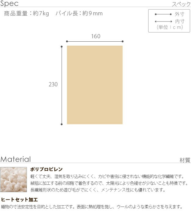 | サイズ | 本体:約230x160cm 毛足長さ(パイル):約9mm 重量:約7kg |